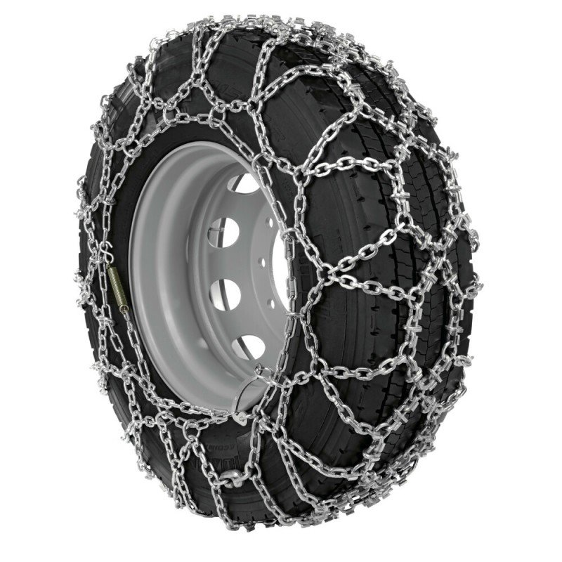 Coppia catene da neve per trattori, macchine operatrici e veicoli speciali. Battistrada a doppio rombo in acciaio speciale zincato con aggiunta di maglie di rinforzo e barrette anti-usura da 1 cm di spessore Maglie con sezione a D da 7, 8 e 10 mm Tensionamento manuale tramite catenino e leva Confezionate in casse plastica