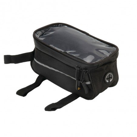 Ampio e capiente borsello con cerniera (1,2 L) Tasca porta telefono con sezione frontale trasparente per uso touch screen. Fissaggio al telaio tramite nastri a strappo Realizzato in robusto poliestere 600D con finestra in PVC impermeabile Inserti riflettenti