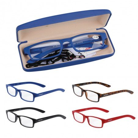 Montatura in policarbonato con finitura soft touch effetto gommato. Aste con sistema flex per una migliore adattabilità al viso. Custodia rigida con finitura soft touch effetto gommato. Cordino reggi-occhiali e panno di pulizia Assortito in 6 gradazioni e 4 modelli. Display da banco in omaggio (Art. DESPO2)