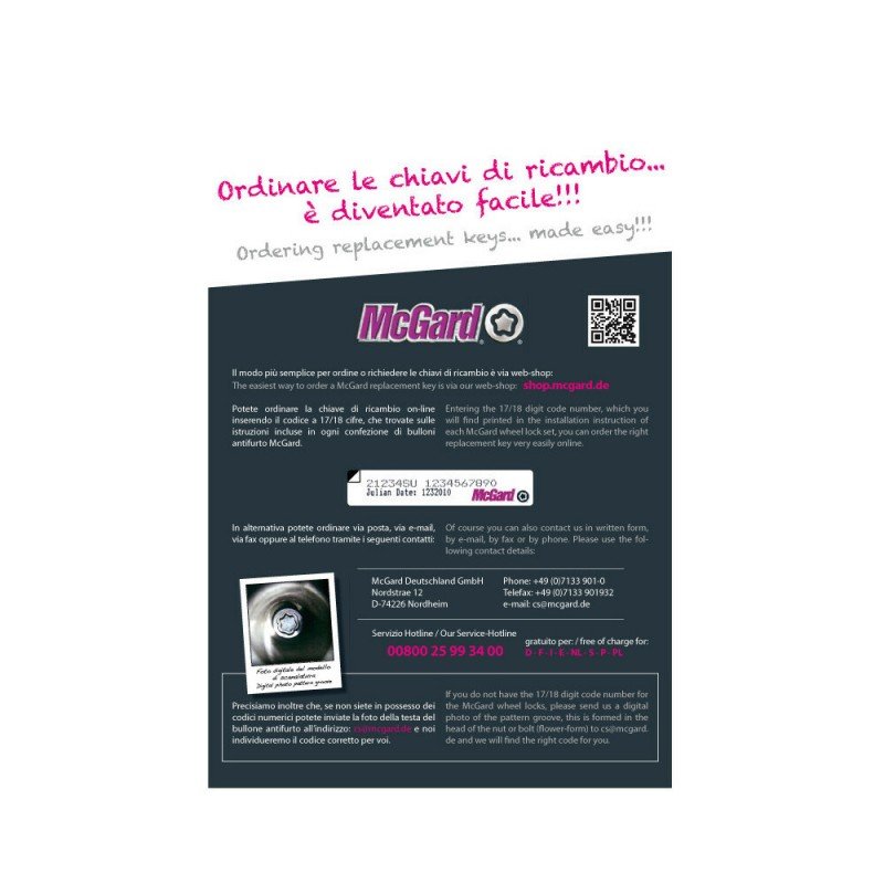 Il modo più semplice per ordine o richiedere le chiavi di ricambio è via web-shop: shop.mcgard.de